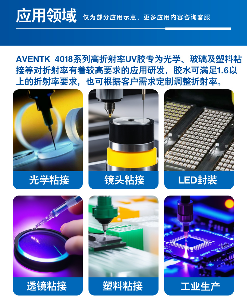 AVENTK 4018系列UV膠水主要用于粘接TAC和玻璃材料,具有高折射率、高粘接強度、固化速度快等特點(diǎn)。