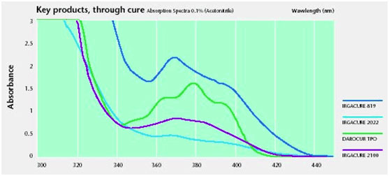 下圖是幾種常見(jiàn)光引發(fā)劑的吸收光譜圖,可以看到不同引發(fā)劑在不同波段的吸收強度是有很大差異的。