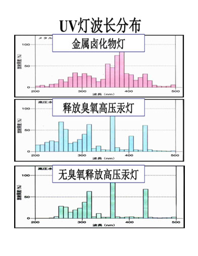 UV LED不管是365nm,395nm還是其他,基本都是單波長(cháng)發(fā)射光譜,而傳統的汞燈,雖然由于添加物不同光譜范圍有所差異,但不管哪一類(lèi)都是全波長(cháng)發(fā)射光譜。