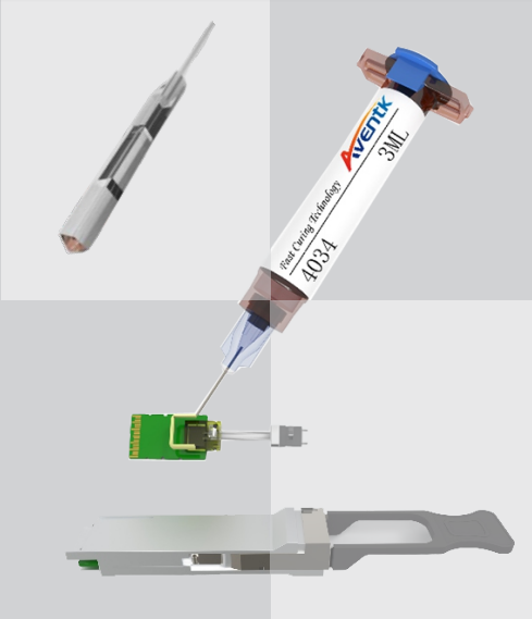 在進(jìn)行光器件封裝時(shí),通常要求膠水通過(guò)UV和加熱固化后,低收縮,與光器件保持一致膨脹系數,不產(chǎn)生應力,精密固定,低鹵素,固化后耐雙85測試,耐水煮等。以前這個(gè)應用點(diǎn)大量使用EMI3410,但是隨著(zhù)客戶(hù)國產(chǎn)化需求提高,AVENTK所生產(chǎn)的4034W系列UV熱固膠開(kāi)始逐漸被客戶(hù)使用和普及。