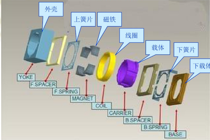 如上圖所示,VCM板塊可分為外殼、上簧片、磁鐵、線(xiàn)圈、載體、下簧片、下載體。首先,VCM外殼多為不銹鋼材料,少許為鋁制品。